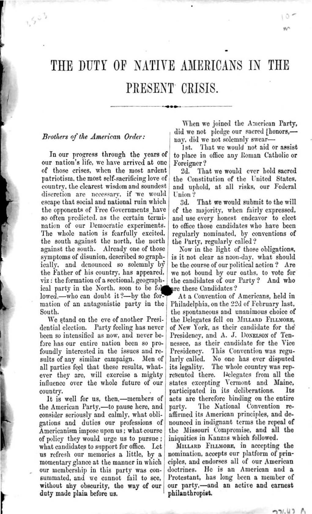 Buntline clearly took note, and soon led a campaign to disband secret lodges. Soon after, Know Nothings rebranded, adopting the “American” party label, and committed to conduct political campaigns openly, with all the trappings of a mass political party. This new phase of the American Party is perhaps best embodied by its candidate, Millard Fillmore, who ran on patriotic anti-Catholicism and a conservative unionism intended to appeal to both working-class northern nativists and former cotton Whigs who fretted sectional polarization. That coalition did not hold. In fact, the campaign failed spectacularly—Fillmore carried just one state (Maryland)—and so did the American Party, which all but disappeared.
