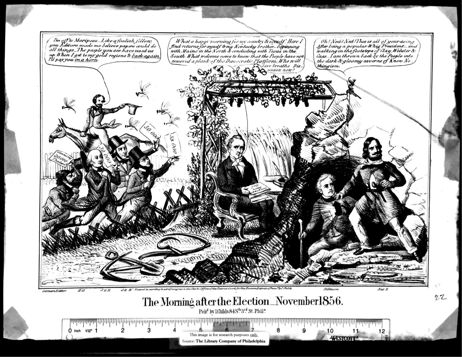 Millard Fillmore, emerging from the mouth of a cavern, holding a lantern: Oh! Ned! Ned! This is all of your doing. After being a popular Whig President—and walking in the footsteps of Clay, Webster & Cass. I am thrown back by the People into the dark & gloomy caverns of Know Nothingism.