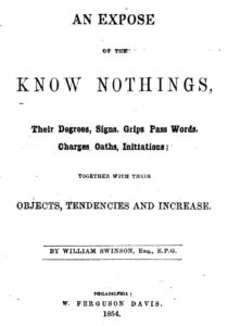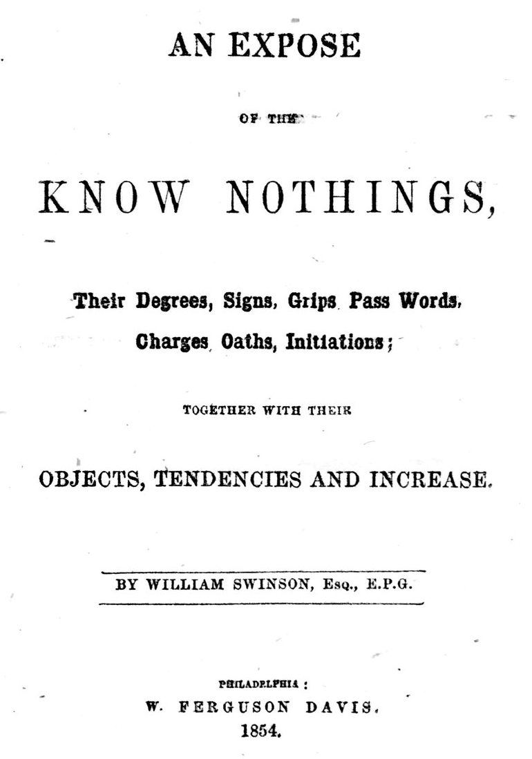Throughout the early-1850s Know Nothingism thrived in secret fraternal lodges modeled on Buntline’s order (OUA). In fact, the term “Know Nothing” derived from members’ practice of feigning ignorance when asked about the organization. When forming a new lodge, Know Nothings often struggled to find secret meeting spaces. Know Nothings also traded in an array of esoteric rituals—elaborate handshakes, oaths of allegiance, vouching, and hierarchical titles—that garnered significant public curiosity. At the Library Company of Philadelphia, I found half a dozen “exposes” published in 1854 alone, each promising to unveil esoterica of the strange order. One expose, published by a “Know Something,” issued the following warning:
