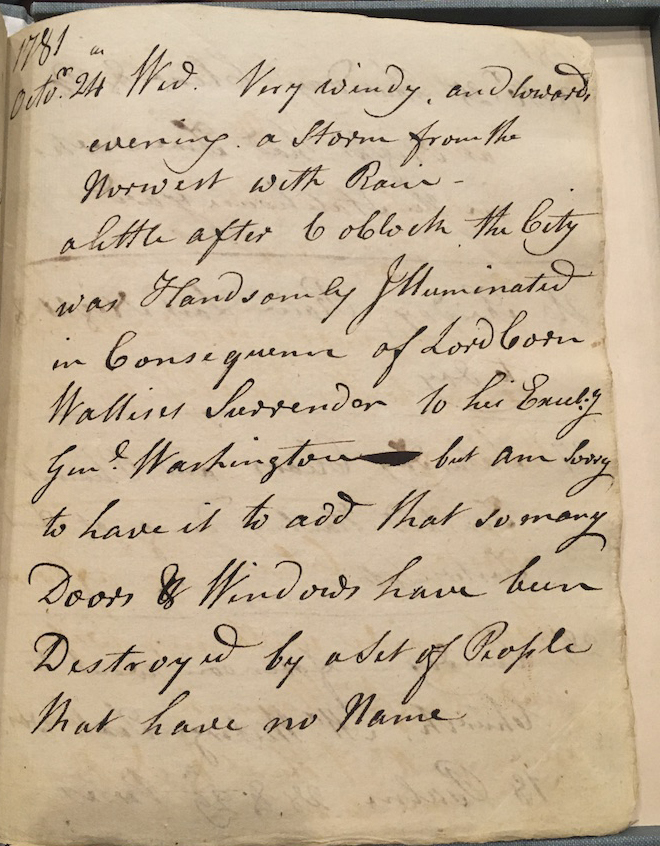 a little after 6 o’clock the City was Handsomely Illuminated in Consequence of Lord Cornwallis’s Surrender to his Excel. Gen. Washington but am sorry to have it to add that so many Doors and Windows have been Destroyed by a set of People that have no Name